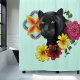 A powerful black jaguar tattoo-style portrait. Surrounding the jaguar’s face are vibrant, colourful Mexican flowers in reds, fuchsia and yellows. Behind the Jaguar is a traditional Mexican tile in a backdrop of teal.