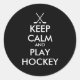 Black keep calm and play hockey stickers. Stick and puck design. Customisable Keepcalm template with custom background colour and text. Hockey Keepcalmandcarryon theme. Create your own funny parody. Cute idea for coach, team, player or fan.