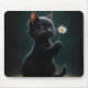 A tiny black kitten sits, gently holding a white daisy in its paws, with a calm and curious expression