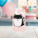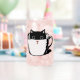 Sweet little cat is sitting in a coffee cup decorated with pink nose