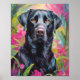 A striking modern art portrait of a black lab set against an abstract pink and green floral garden background. The dog’s dark silhouette contrasts beautifully with the vibrant, swirling colours of the garden, blending nature and animal in an expressive, contemporary style. The abstract brushstrokes create a sense of movement and energy, making this unique piece both playful and visually captivating.