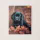 This puzzle features a cute black Labrador retriever puppy resting in a pile of leaves.