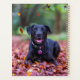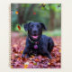 A black Labrador retriever laying amongst brown, yellow and orange autumnal leaves, with leaves falling through the air