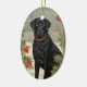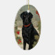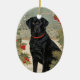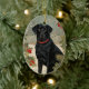A black Labrador Retriever sits in a snowy winter scene, framed by holly branches with red berries. The dog has a red collar and looks directly at the viewer with a calm and dignified expression. The background features a snowy forest with bare branches and a soft, muted colour palette. The image evokes a sense of tranquillity and the beauty of winter.