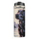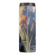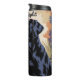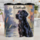 This stylised illustration features a black Labrador Retriever with a watchful gaze, sitting by the edge of a body of water. The background consists of abstract, muted-coloured foliage in shades of blue, purple, and orange, suggesting reeds or tall grasses. The art has a calm, natural, and somewhat nostalgic aesthetic.
