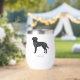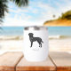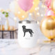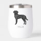 Destei's original cartoon illustration of a black colour Labrador Retriever breed dog. The dog has a kind face expression that is framed by her large floppy ears. The dog design pictures the dog from the side while standing. The dog's head is turned the viewer of the image. There is also a personalizable text area for a name or other custom text.