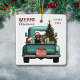 A teal blue retro pickup truck carries a decorated Holiday tree and gift packages on this cute ceramic Christmas ornament. Looking out from the tailgate is a black Labrador Retriever dog wearing a red and white Santa Claus hat. A rustic wooden sign on the back bumper says "Christmas Cheer". The red and green stylised text at the top left says "MERRY CHRISTMAS", with your name (or your dog's) and the year at the right. Both sides have the same image.