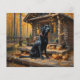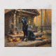 A beautiful black Labrador Retriever sits in front of a cosy log cabin in the woods in autumn