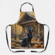 A beautiful black Labrador Retriever sits in front of a cosy log cabin in the woods in autumn