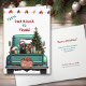 A teal blue pickup truck carries a decorated Holiday tree and gift packages on the front of this cute Christmas card. A black Labrador Retriever Dog looks out from the tailgate. A rustic wooden sign on the back bumper says "Christmas Cheer". At the top of the card is a string of Holiday lights, and custom text which currently says "From Our House to Yours". The inside of the card has more text fields for you to customise.
