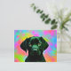Black labrador sitting in front of a colourful postcard