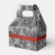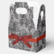 Gable-style favour box with an image of black lace over white adorned with a red satin ribbon with a red satin bow with a ruby heart detail. See the entire Cancan Favour Box collection in the PARTY FAVORS section.