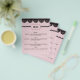 Create a beautiful menu for celebrating your special day. These simple small paper sheets have pretty, modern look. This design features my black lace illustrations set against a soft pink background. On the front you can customise the course names and food descriptions with your own text. On the reverse side you can personalise these menus with the name of the bride and groom and the wedding date.