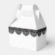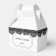 Create your own personalised packaging for wedding favours. This favour box is ready to be customised with your names and wedding date inside of an ornate frame. The white background has a faux quilted pattern and is accented by my black lace illustration.