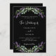 A black background decorated with lavender flowers and eucalyptus greenery. Personalise and your names and details.