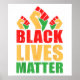 The image contains three raised fists in red, yellow, and green colours at the top. Below the fists, the text "BLACK LIVES MATTER" is written in bold, distressed letters. The word "BLACK" is in red, "LIVES" is in yellow, and "MATTER" is in green.