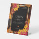 Create a captivating focal point at your wedding reception with our exquisite open bar pedestal sign. This stunning design features a rustic backdrop of autumn leaves, complemented by a shorter, black panel adorned with a shimmering gold frame and surrounded by autumn foliage. The couple's names are elegantly displayed in the upper corner, adding a personalised touch.