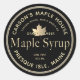 Simple and Elegant Round Black Maple Syrup Label with the words "Maple Syrup" in an embossed metallic gold font. Triple line border in gold. GOLD maple leaf and text.