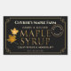This maple syrup label can be customised with your business name, address and maple syrup volume in ounces and milliliters. There is a handy list of common container sizes with their conversions in the form field where you fill in your information. Black background with gold text and border. For a special touch, the word “maple syrup” has a gold gradient. Two sugar maple leaves and an editable circular logo with "Spring Season 202X" add a special touch.