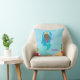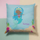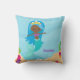Beautiful beach house kids room pillow. Cute baby blue ocean theme girls bedroom decor for a black girl who loves swimming in the summer with mermaids. Features a pretty blue hair African American mermaid swimming around lovely coral. Children's playroom pillows.