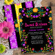 Floral Sweet Sixteen Invitation for your daughter's 16th Birthday celebration. This pretty theme features bright and colourful Mexican folk art flowers in red, pink, purple and yellow on a black background. The back of the card has Mexican fiesta, floral papel picado in bright purple, yellow and pink. The template is set up ready for you to customise the card with all your personal details for your sweet 16 birthay party. Please browse our store for matching and coordinating items.