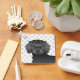 Destei's original cartoon illustration of a cute black coat colour miniature Goldendoodle breed dog's head. There is also a personalizable text area for a name. The background has a pattern of grey dog paw prints.