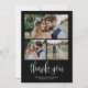 This black three photo calligraphy wedding thank you card features your wedding photos, with calligraphy script overlay. Customise your special wedding thank you on the back, or remove it to leave the back blank for your handwritten message of thanks.