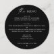 Elevate your reception with this bold and contemporary round wedding menu, designed in sleek black for a dramatic yet refined look. With its minimalist style and modern circular shape, this menu makes a stylish impression while keeping the focus on your carefully curated meal. Perfect for urban, industrial, or black-tie weddings. It adds a polished detail to your table setting and complements a wide range of themes. Personalise with your wedding details for a striking and unforgettable finish.