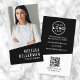 Black Contemporary Photo QR Code Logo Vertical Business Card. This contemporary vertical business card is designed for corporate professionals, small business owners, freelancers, and consultants who value clean, modern design. The front features a striking black background with sleek white fonts, showcasing your photo, company logo, name, and title or business name in a bold and professional layout. The back continues the black aesthetic with your contact details, a scannable QR code for instant connections, and minimalist social media icons, paired with the phrase "Connect with us!" for a polished and approachable touch. The sharp contrast of black and white, paired with clean typography, gives this card a refined and versatile style, perfect for any brand looking to leave a strong impression. Personalise yours today to stand out with confidence and style!