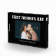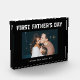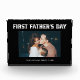 This modern black and white Father's Day photo block for the first time dad features a simple, dark black background with masculine white script typography that says "First Father's Day." Add a photo of him and the baby, with room to personalise with names and year.