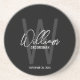 This design features personalised groomsman's name in white modern handwriting script font style and monogram in grey modern sans serif font style as background, with wedding details in white modern sans serif font style, on black background.