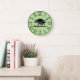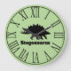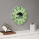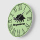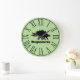Black modern stegosaurus silhouette clock with a green background and large black roman numerals.