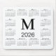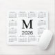 Minimal calendar mouse pad features a black 2026 calendar on a white background with a bold black custom monogram above the year in the middle. Add your initial in the sidebar.