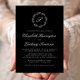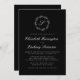 This elegant wedding invitation design features a white script monogram initial encircled by a line art botanical wreath on a black background. The names appear in white script, with the rest of the text in classic serif font. The back of the card is solid black.