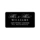 Elegant white flourishing calligraphy spelling "Mr. & Mrs." stands out against a dramatic black background on this sophisticated wedding return address label. The family name and address appear in refined small caps for a striking, formal finishing touch to your bridal mailings. All text is fully customisable.