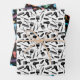 Hair stylist themed wrapping paper sheets featuring a pattern of scissors, combs, and hair dryers in three different colour variations: black and white; tomato red, yellow, blue, and purple on black; and pastels against a black background.