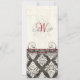 COLOR PALETTE: black, white and redDESIGN COLLECTION: aged, worn damask hand painted from original art work of Audrey Jeanne Roberts, this elegant and sophisticated wedding invitation can be customised to any colour you require. The top part of the invitation is a crackle finish soft off-white with a hand drawn flourish swirl design element across a border of black and red. The bottom portion is a textured aged black with white floral modern damask pattern. The reverse side is the crackle finish soft cream with swirls and flourishes.