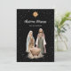 Beautiful black Christian Christmas card featuring a scene with Mary, Joseph and the infant Jesus Christ in the manger in Bethlehem on the front and a watercolor painting of poinsettia, holly and red berries at the back.