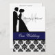 Black and white damask print with a navy blue band, a silhouette bride and groom, and areas you can personalise with your names, monogram initial, wedding ceremony and reception information on a customised wedding invitation that's classy and traditional all in one!