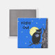 This square magnet has a black owl with blue eyes sitting in a black tree against a blue night sky with a yellow moon and stars with the text Night Owl.