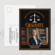 This modern black and orange custom law school graduation announcement postcard features classy typography for a class of 2024 graduate above your student photo. Customise with your graduating year under the white scales of justice and photograph for elegant personalised lawyer or attorney postcards.
