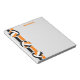 This volleyball themed notepad features 3 team colour volleyballs with black, orange and white panels overlying vertically orientated black and orange varsity stripes on the left edge - coach's name is customisable - by katz_d_zynes