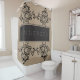 Intricate and ornate black scrolled leaves frames on the top and bottom with centre black rectangle decorative monogram. Personalised text is white and in a dot style font. Great glam rock style shower curtain.