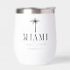 Welcome friends to your bachelorette weekend with these cute personalised bachelorette party wine tumblers. Perfect for beachy or tropical locales, this design features a black palm tree silhouette illustration with your destination beneath (shown with Miami) in classic serif lettering. Add your name(s) or occasion name beneath in handwritten cursive script, as well as the year.