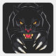 A black panther, positioned centrally in the image, is depicted in a bold, stylised illustration. The panther's face and upper body are featured, with its mouth open, revealing sharp teeth. The animal's eyes are a striking yellow, and its claws are extended, adding to the sense of power and aggression. The panther's fur is a deep black, contrasting starkly with the black background. Strong, defined lines and shading create a sense of volume and texture, showcasing the muscular form. The lighting emphasizes the panther's features, with no visible shadows, suggesting a spotlight or graphic design aesthetic. The style is bold, graphic, and dynamic, ideal for a logo or poster. The image's composition and perspective are directly focused on the panther's intense facial expression and powerful stance, creating an impression of ferocity and strength. Important details include the pronounced claws and the wide-open mouth.