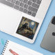 A black panther themed sticker. On the front is an illustration of a majestic black panther with fur like molten black and gold, laying on a cliff ledge bathed in ethereal moonlight. Intricate carvings adorn crumbling stone pillars, and bioluminescent flora casts a soft, otherworldly glow. The scene is rendered in a rich, textural oil painting style with thick, .