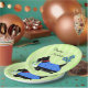 Enjoy a party, meeting or other event with these fun and whimsical "Party Scottie" disposable paper plates. Customise with other words, a birthday or other event or celebration, or personalise with your dog's name. Your dog love will shine with these unique one of a kind paper plates with a cute black terrier dog dressed for the occasion. This whimsical black Scottie Terrier is wearing a blue sweater coat with tonal blue stars and a red collar. A lime green and turquoise ball is behind the Scottie and a large white dog bone is at his or her front paw.  The background is a lime green tonal stripe pattern to make a stylish, trendy and custom decorative disposable paper party plates. Three turquoise teal blue flowers are above the dog. This cute, cuddly and trendy dog is original art by Phyllis Dobbs and will melt the heart of a dog lover. This Scottie is one of a series of 6 Scotties and all are fully customisable to make it your own! Coordinate with matching products.