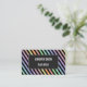This business card design features a pattern of lines (or stripes) coloured various pastel colours, with black lines in between them. The front also features a dark-coloured rectangular shaped area containing a name and a profession/role/title/position that can both be personalised. The back features a simple design including a name, a profession/role/title/position, and contact info that can be personalised. This business card design might be used by a nail artist, a cosmetologist, a painter, or an interior decorator. [~Z0000061]