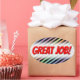 This design features a pattern of lines (or stripes) coloured various pastel colours, with black lines in between them. It also features the message "GREAT JOB!".
