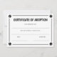 Cute pet adoption certificate in white with a paw print frame. Black and white certificate of adoption printed with cute paw prints. White and black certificate of pet adoption with cute fonts and paws.